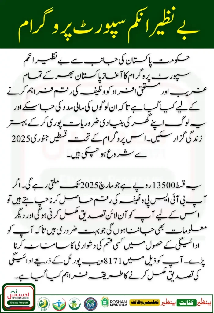 This instalment is Rs. 13500, which will continue to be given until March 2025. If you want to get the BISP stipend amount, you have to complete the online verification for it and also have to know other important information so that you do not face any kind of difficulty in getting the payment. You have been provided with the method to complete the payment verification through the 8171 web portal below.