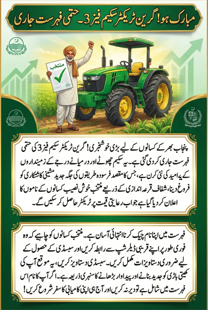 Green Tractor Scheme Phase 3 Final List has become a significant milestone for farmers across Punjab. This initiative, aimed at promoting mechanized farming, has brought hope to small and medium-scale landowners who struggle with outdated tools and labor-intensive work. The announcement of the final list of selected farmers has been eagerly awaited, as it determines who will receive subsidized tractors in this latest phase.